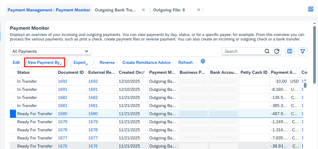 Users initiate the process by creating payments using the standard Outgoing Bank Transfer functionality in SAP Business ByDesign, ensuring consistency with existing financial processes.
