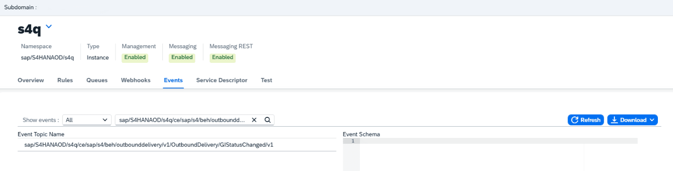 During the Order-to-Cash process, once PGI and Outbound Delivery Release occur, SAP S/4HANA Public Cloud emits a Business Event. This event is published to SAP Event Mesh, which then forwards the payload to a custom iFlow in SAP Integration Suite. The figure below shows the outbound delivery event as it appears in SAP Event Mesh.