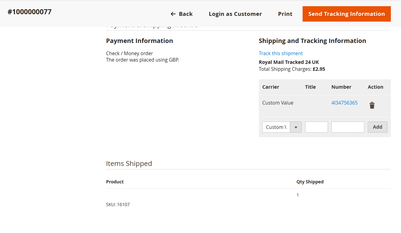 The shipment created in Magento appears as shown below for the corresponding customer order.